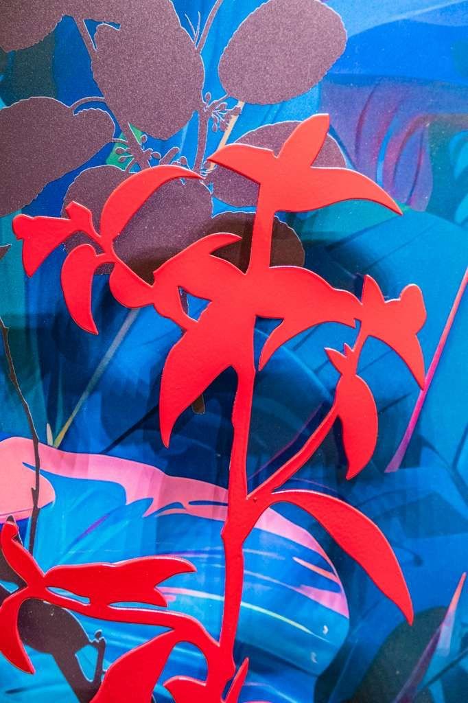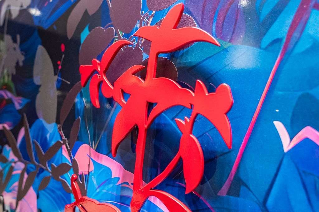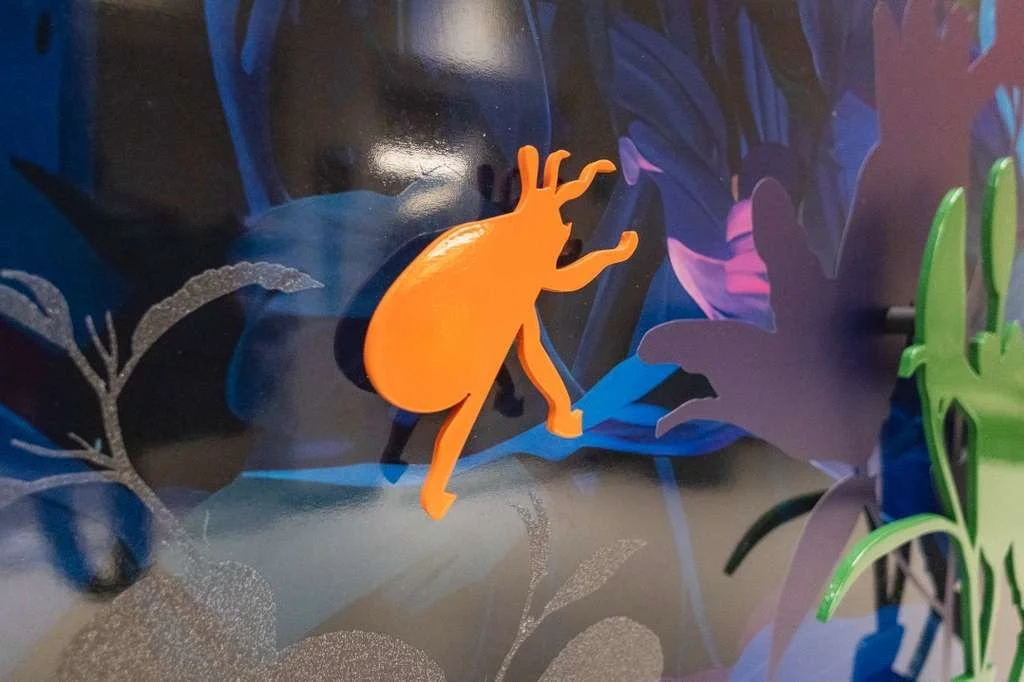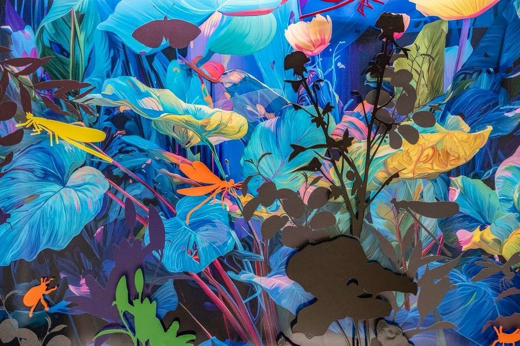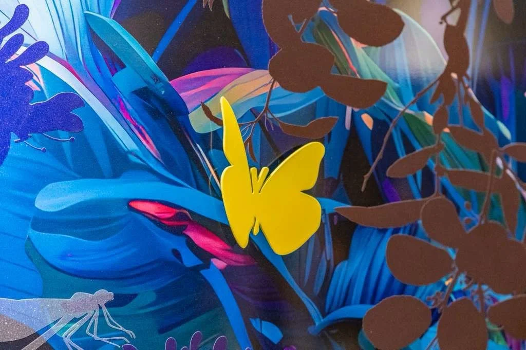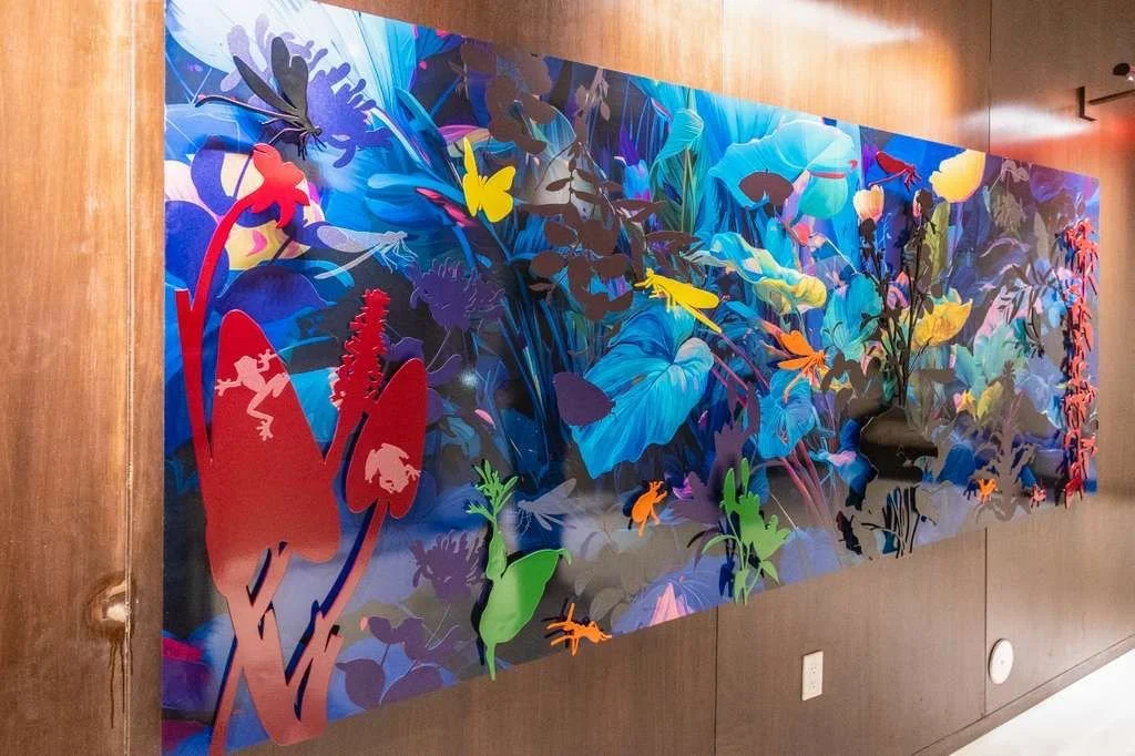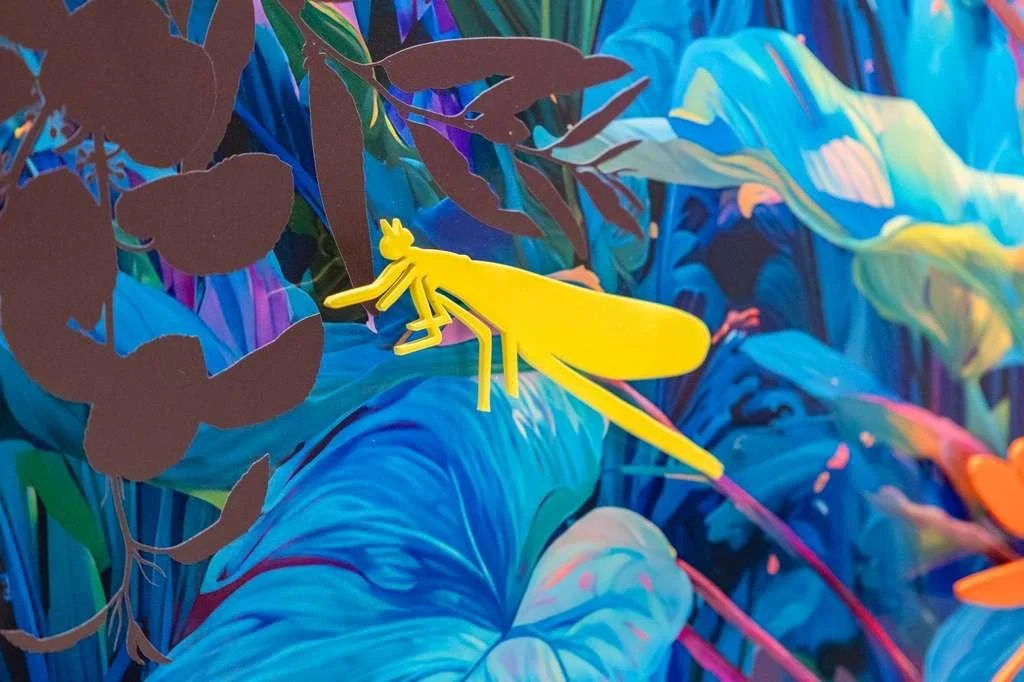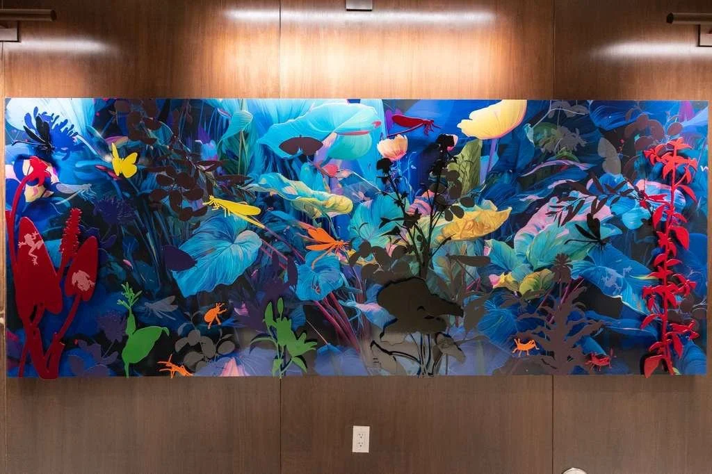 Rooted in the nocturnal ecosystems of South Florida, this work reflects a landscape shaped by rising seas, rapid development, and ecological displacement. Dragonflies, butterflies, and frogs appear as indicators of environmental health—species whose presence signals both resilience and vulnerability. Rendered in saturated blues and luminous color, the garden becomes a listening body rather than a scenic backdrop, attuned to vibration, moisture, and movement after dark. Silhouetted forms suggest fragmentation and loss, while glowing surfaces point to adaptation and survival. The work invites viewers to slow down and reconsider their relationship to the land, shifting from passive observation toward stewardship and care for the fragile systems that persist beyond human attention.